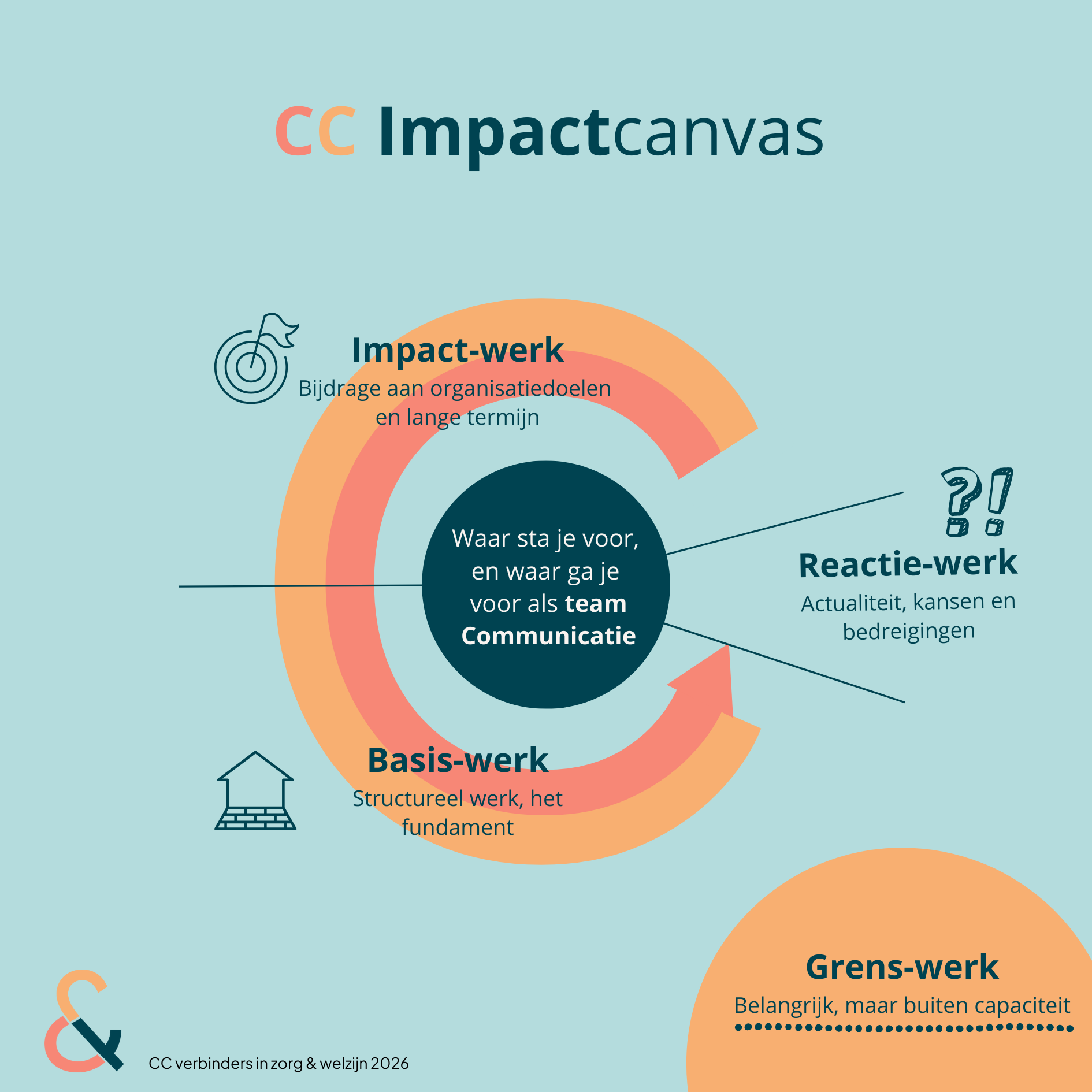 Het CC Impactcanvas ondersteunt daarbij. Het helpt om inzicht te krijgen in hoe de schaarse communicatiecapaciteit van het team wordt ingezet in relatie tot organisatiedoelen. Door het werk te ordenen ontstaat overzicht: waar gaat de capaciteit naartoe, waar levert die aantoonbaar bij aan bij de opgaven van de organisatie, en waar niet? Zonder daarbij te verzanden in discussies over uren.